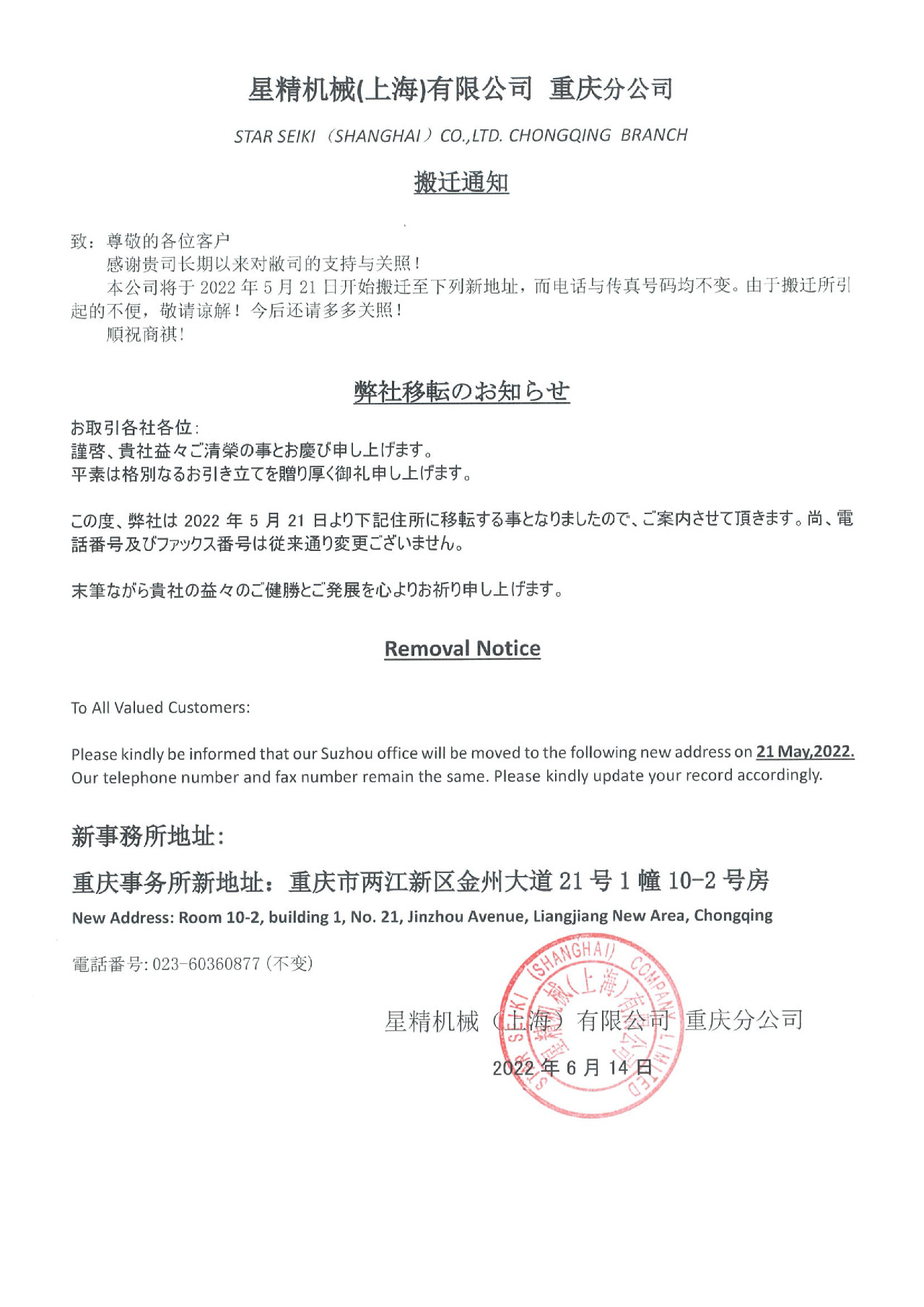 STAR重慶事務(wù)所搬遷通知